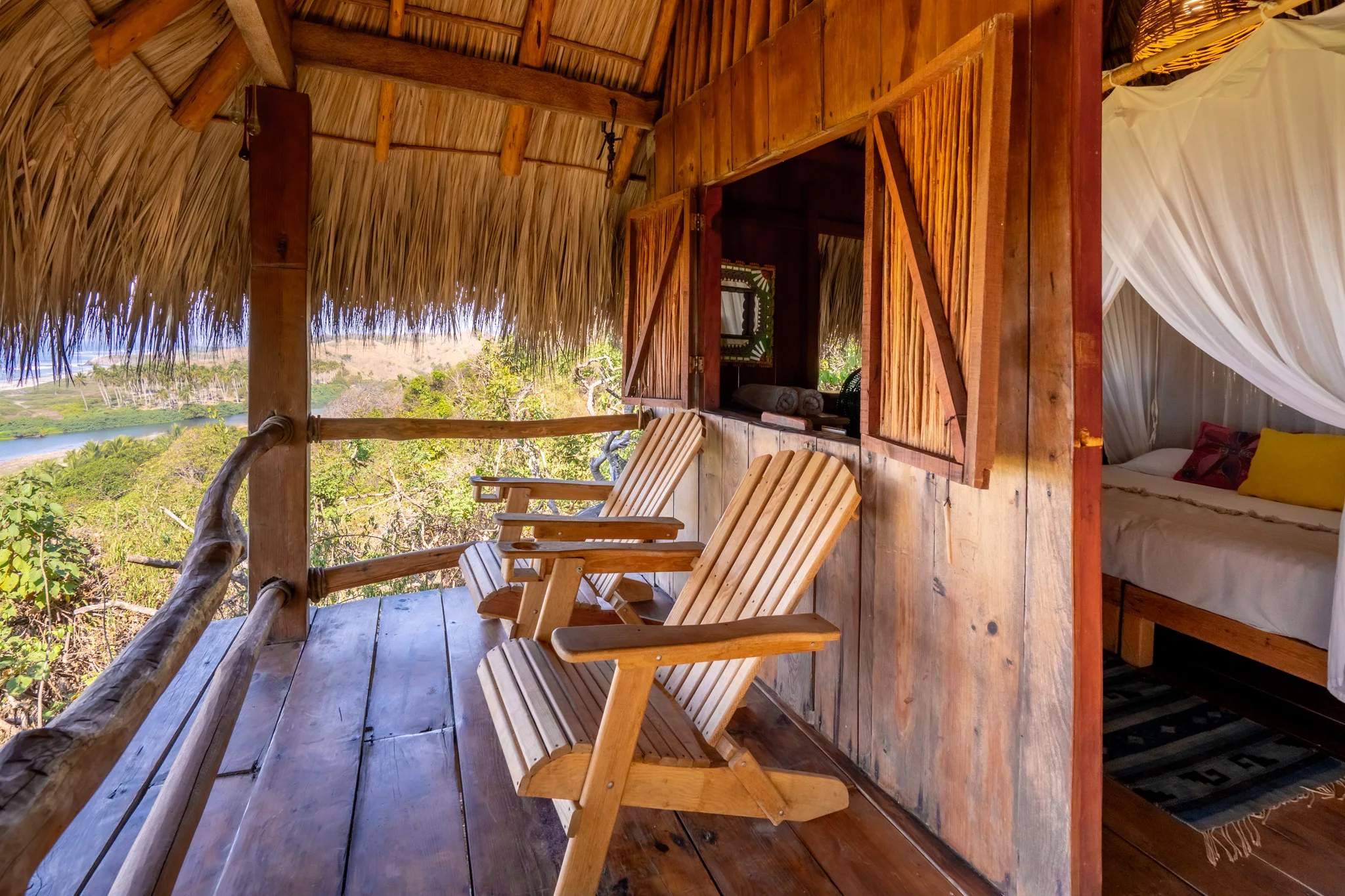 Diseñada en dos niveles, en la planta superior se encuentra una cómoda cama king size y una terraza con hamaca, ideal para dejar pasar las horas entre el vaivén del descanso y el canto de los pájaros. Abajo, el tapanco cuenta con un sofá amplio, perfecto para leer, meditar o simplemente contemplar el entorno.